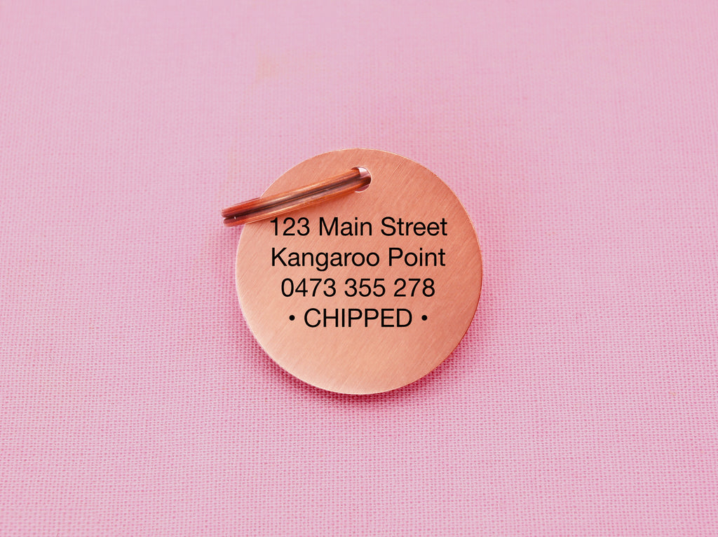 - Side 1 - Your pet's name (this will be engraved in uppercase. No other information can go on the front.)